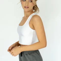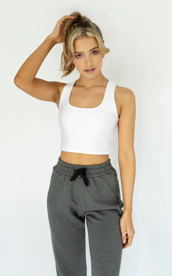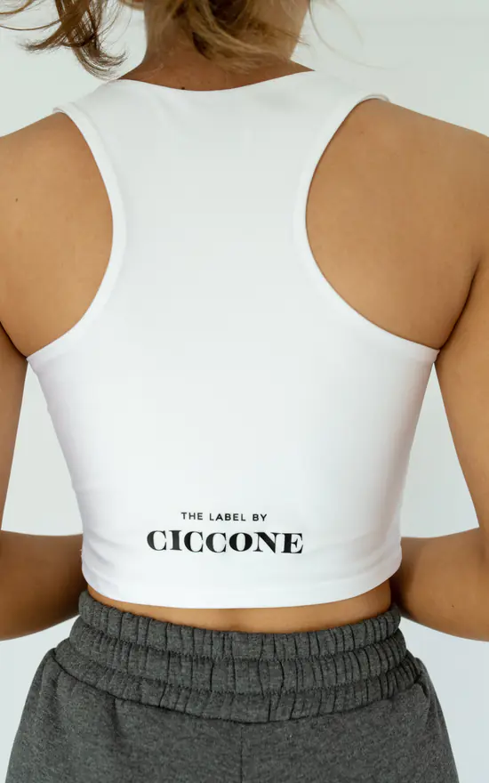 The Label By Ciccone crop top, made with soft material that holds you in all the right places. This classic crop in white has a racer back with a scoop neck front; black printed text on the lower back, which provides an elegant feel.