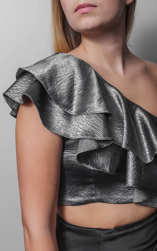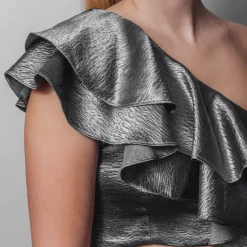 Diagonal frills from shoulder to the hip, offering the ultimate dramatic effect to bold up any simple attire.