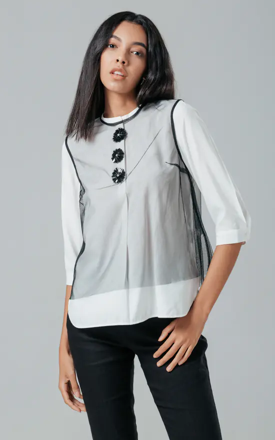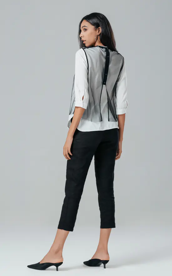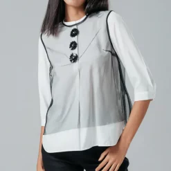 A perfect overlay top, designed to add bit of elegance, to any vest or a shirt. This top is made with a light mesh fabric, with tonal embellishments which are hand stitched on the center. The back fastening, makes it easy to put on, and its light weight, makes it comfortable to wear, even in warm climates.