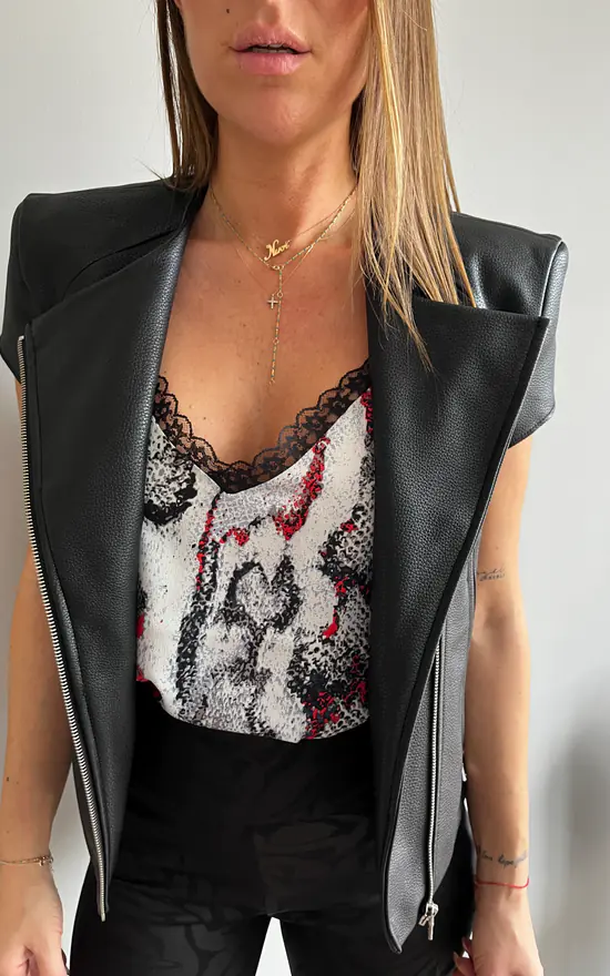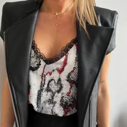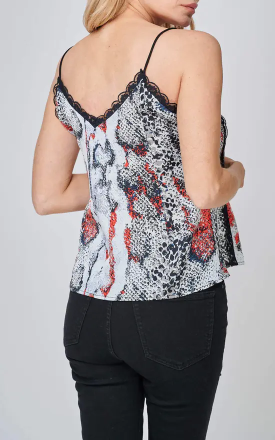 This classic camisole top in a lightweight fabric that has multicoloured abstract snake print with hues of grey, white and red. With delicate lace trim and thin spaghetti straps in contrasting black fabric. Lace trim on one side down the top and on the other side it is just plain print. Designed to be worn reversible if you choose to wear the lace at the front or back.